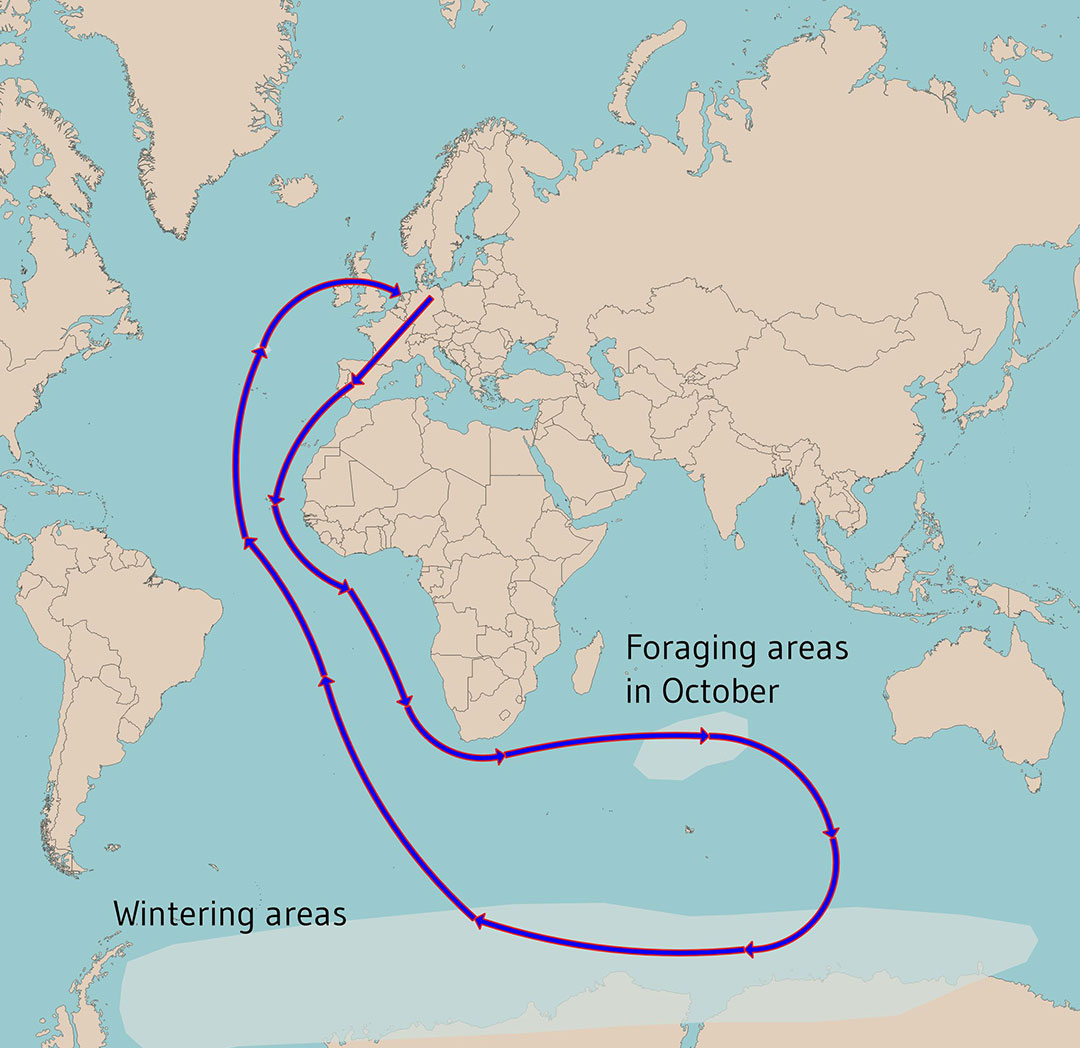 Migration routes and stopover areas of 16 geolocator tracked THE ARCTIC TERN Muuton maailmanennätys.
